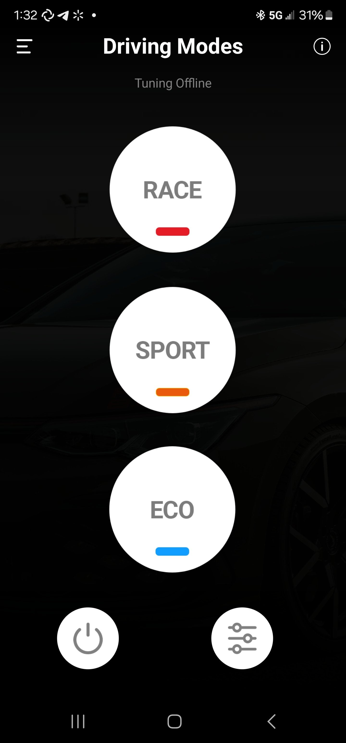 RaceChip doesn't like to connect while my phone is connected to my K5. It hangs in the "connecting" phase indefinitely more often than not. I found that I can best connect when I have the car turned off, and turn the K5 and my phone's Bluetooth on at the same time, before my phone connects to the K5. My phone, a Samsung Galaxy S22 Ultra runs Bluetooth 5 and should be able to connect to multiple devices. It connects to the K5 and Dragy reliably every time with ease. It's only the RaceChip that gives me trouble. If you don't even have the car on, the screen around the buttons goes black. When it's connected, the screen is orange.